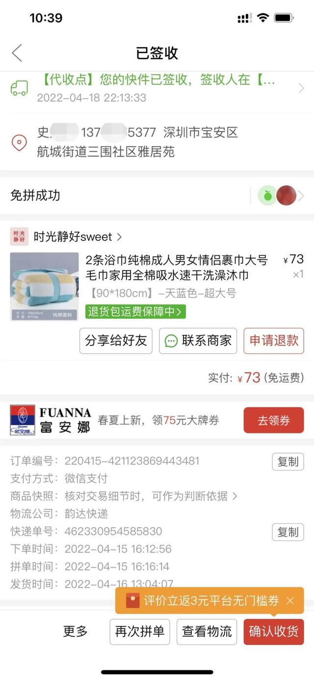 京东助力坏人诈骗—网购有风险!我在京东网站购买了一条0.9米*1.8米的加大号大浴巾,2022年4月16日11时46分下单,微信支付136元,当时网页显示仓库就在深圳,见图片一。4月18日18时18分我收到短消息:【菜鸟驿站】您有2个包裹在深圳固戍雅居苑B栋9单元店,取件码为3-1-5830、3-2-5832,见图片二。当晚22时13分我到菜鸟驿站取回2个快件到家,1个快件打开后是一条大浴巾,另1个快件打开后是一个小块的洁厕宝。躺在床上刷手机想到看看网购的物品还有几件没有到?在拼多多网站看到在2022年4月15日16时12分下单购买的【90*180cm】天蓝色超大号浴巾、微信支付73元,网页显示:已签收!见图片三,已签收?那我刚刚收到的浴巾是在那个网站购买的?再看看京东网站显示的也是:已签收!见图片四,已签收?